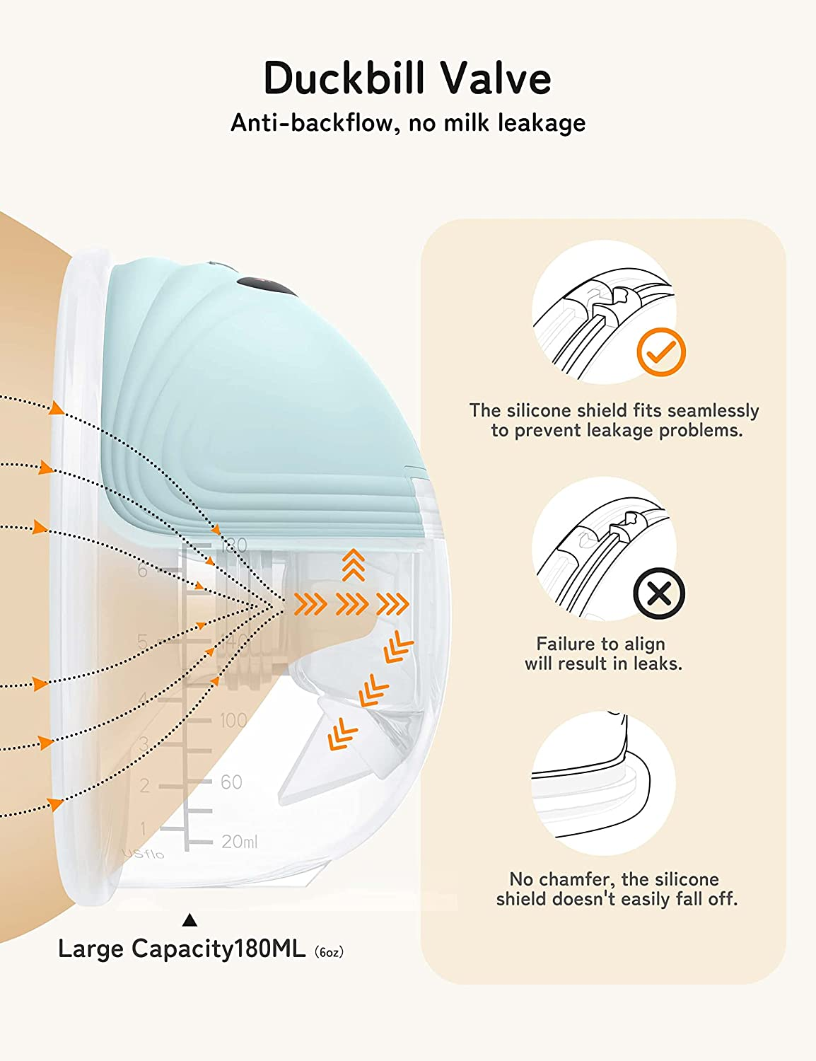 Fuite à l'épreuve et anti-débit: le diaphragme de silicone crée un sceau parfait pour éviter les fuites, et la valve de bill de canard crée un tunnel unidirectionnel qui empêche le lait de reculer. Le collecteur de lait de ce lait peut contenir jusqu'à 180 ml et est marqué d'une échelle claire pour une facilité d'utilisation.