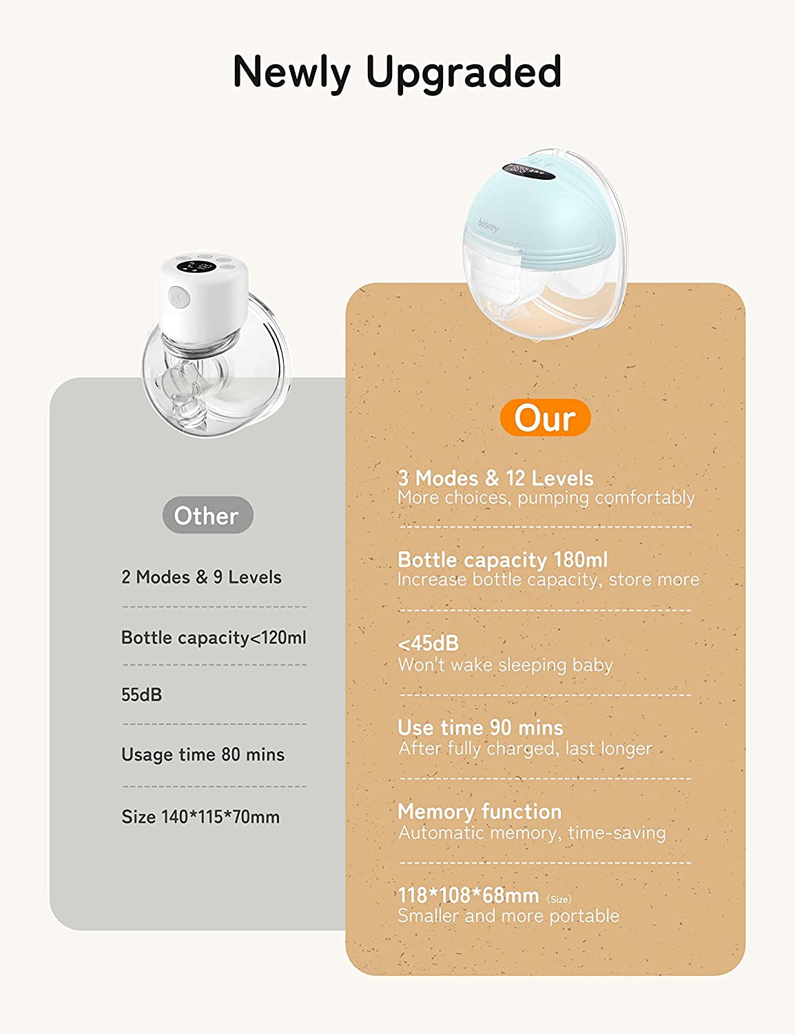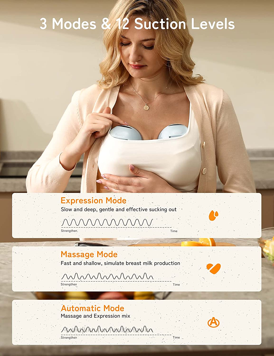 3 modes et 12 niveaux: le poitrine de lait portable Besrey a 3 modes pour vous aider à exprimer plus facilement le lait (automatique, massage et expression). Chaque mode est scientifiquement conçu pour avoir 12 niveaux d'aspiration, imitant l'alimentation du bébé et vous permettant de trouver l'intensité la plus confortable pendant le pompage.