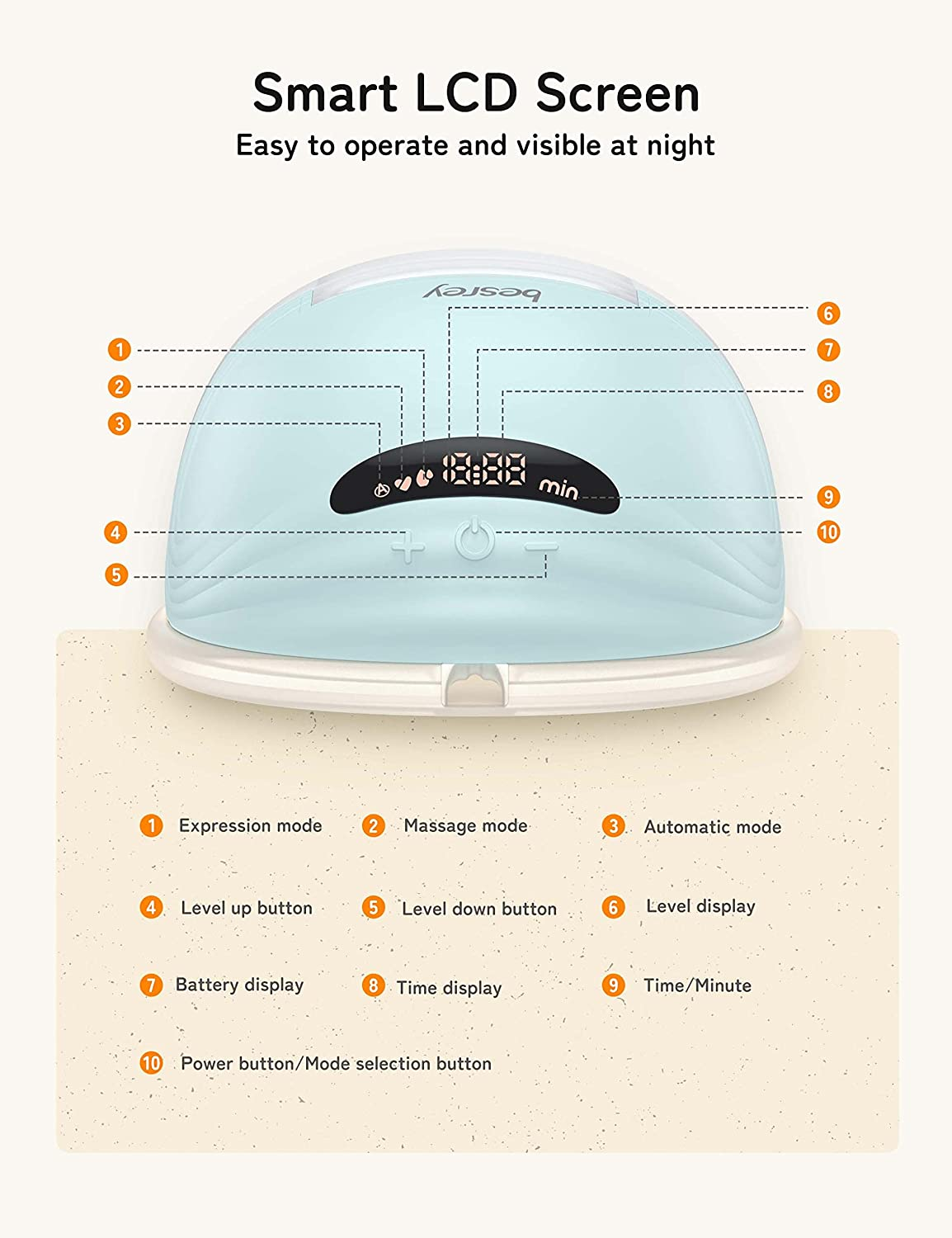 Affichage LCD mis à niveau: Avec un écran LCD, le poitrine de lait sans fil Besrey fournit des informations détaillées pour assurer une expérience de pompage plus fluide. (Remarque: lors de l'échange de l'autre côté du sein après le pompage, il doit être éteint puis allumé à l'utilisation.)