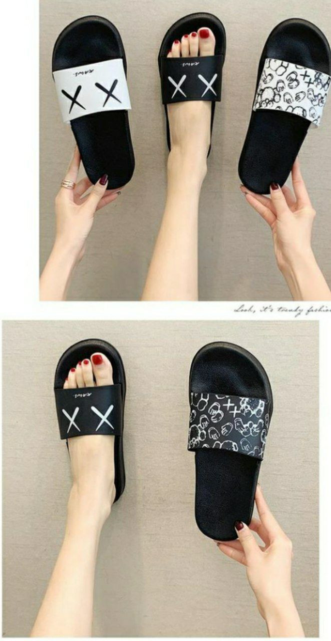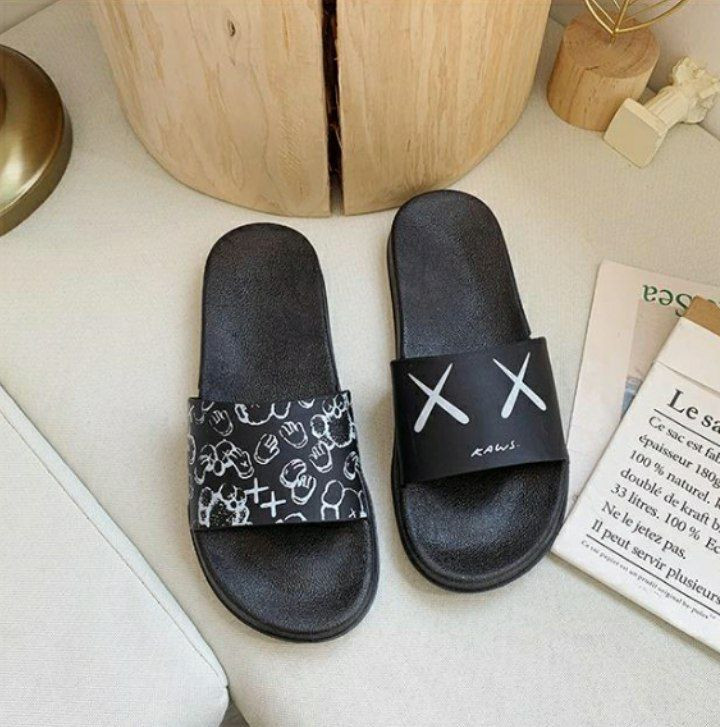 pantoufles Shopee populaires, sandales Kaws de style claquettes, disponibles en noir et blanc avec de différents motif "X.X" ou un motif camouflage/graphique.