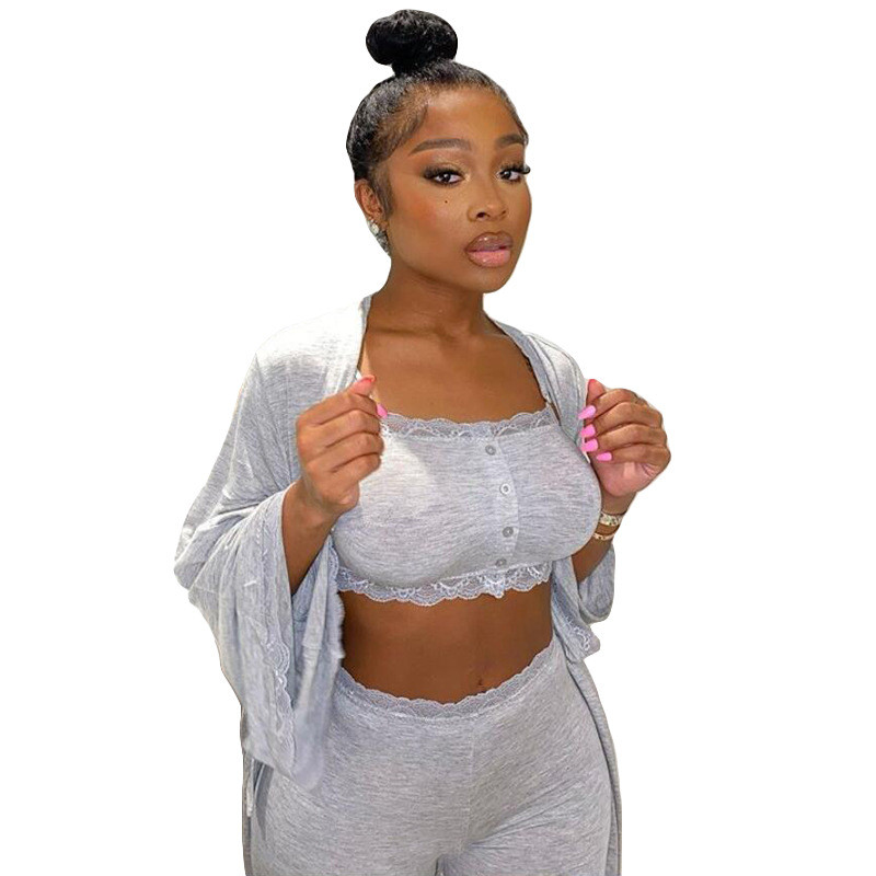 Homewear gray Color Casual Lace Pants Pyjamas Ensemble trois pièces, tenu de sport ou de sortie sexy pour jeunes filles